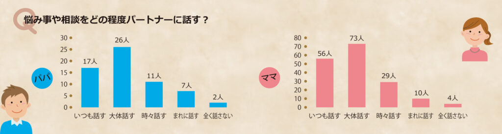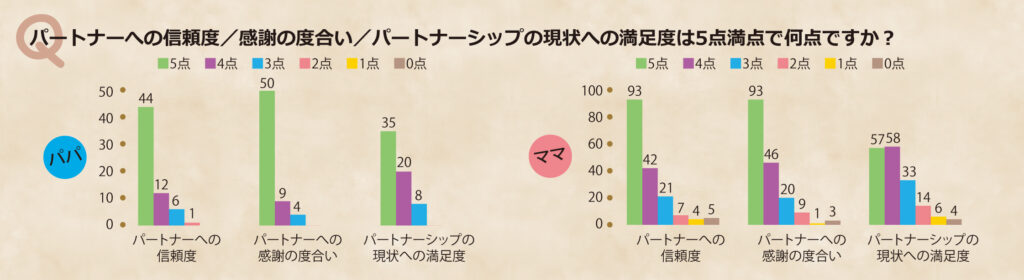 ママのほうがパパよりも辛口に評価する傾向があるようですが、パパママ双方で互いへの信頼も感謝も現状への満足も高く、ここでも良い関係性が見られます。