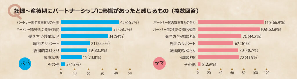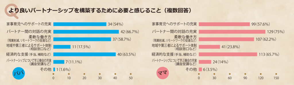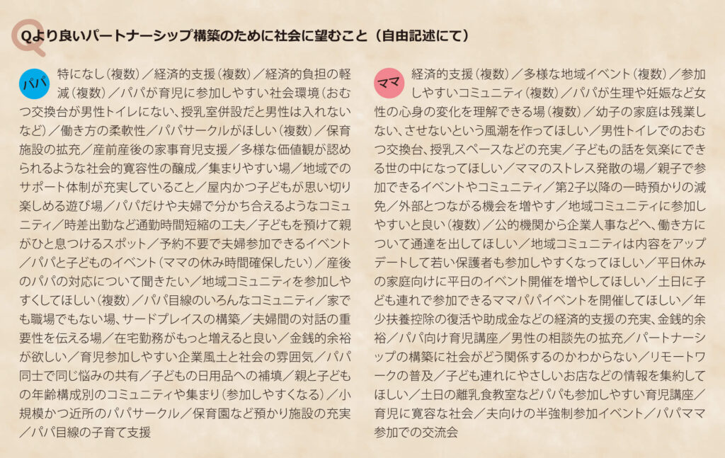 子育て中の皆さんのパートナーシップについて、産前産後の影響や理想と現状のギャップ、改善のために必要なサポートなどをお聞きしました。