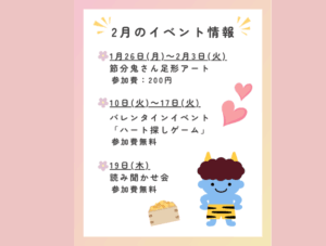 Baby&Kidsリユースショップ「くるりのおうち」では、「節分鬼さん足形アート」やバレンタインイベント「ハート探しゲーム」「読み聞かせ」を楽しめます!お気軽にお立ち寄りください!