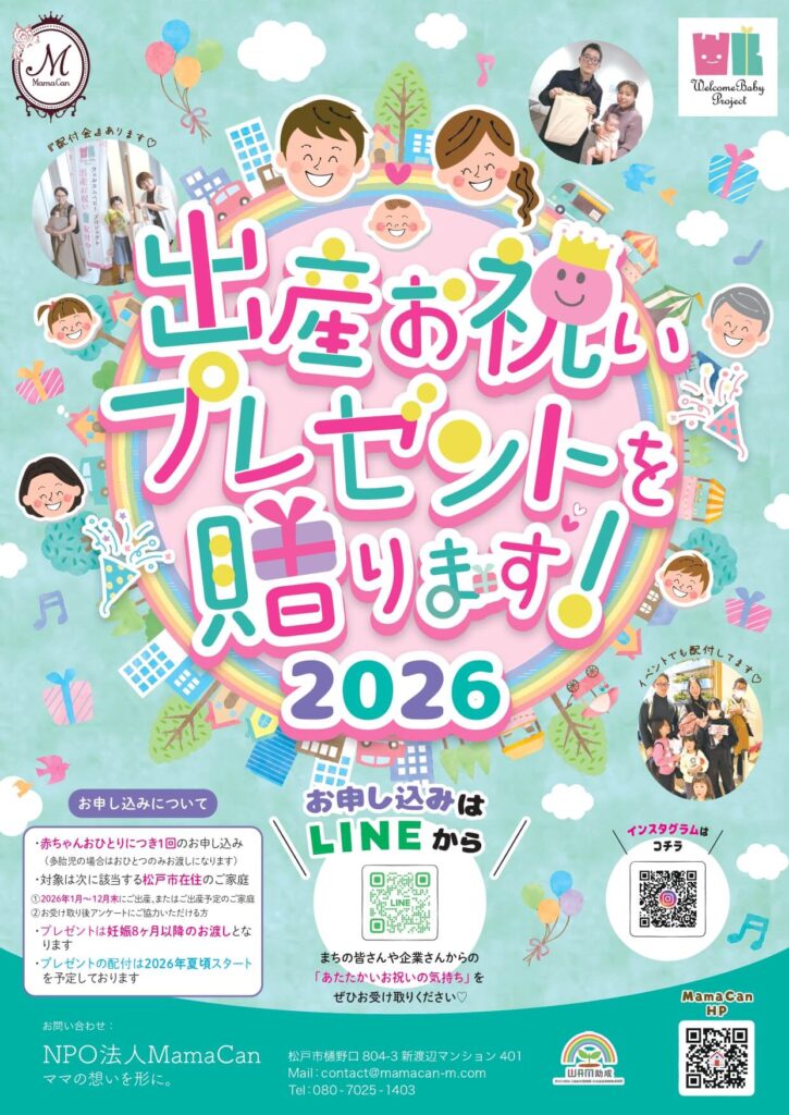出産お祝いプレゼントの2026年度お申し込みがスタートしました。対象のご家庭は、是非お申し込み下さい。尚、プレゼントの配付は、2026年夏頃からを予定しています。配付に関しては、お申し込みの際にお友達登録して頂いた「つながるLINE」でご案内します。楽しみにお待ちください。